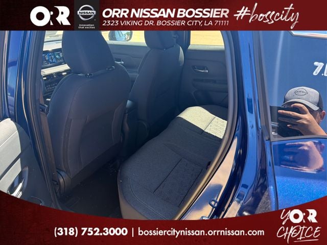 Cold Weather Package (Heated Front Seats, Heated Mirrors, and Rear Floor Heater Ducts), 4 Speakers, 4-Wheel Disc Brakes, ABS brakes, Air Conditioning, AM/FM radio, Auto High-beam Headlights, Automatic temperature control, Blind Spot Warning, Brake assist, Bumpers: body-color, Carpeted Floor Mats and Underfloor Protector, Cloth Seat Trim, Crossbars, Driver door bin, Driver vanity mirror, Dual front impact airbags, Dual front side impact airbags, Electronic Stability Control, Emergency communication system, Exterior Parking Camera Rear, Front anti-roll bar, Front Bucket Seats, Front Center Armrest, Front reading lights, Front wheel independent suspension, Fully automatic headlights, Illuminated entry, Knee airbag, Low tire pressure warning, NissanConnect featuring Apple CarPlay and Android Auto, Occupant sensing airbag, Outside temperature display, Overhead airbag, Panic alarm, Passenger door bin, Passenger vanity mirror, Power door mirrors, Power steering, Power windows, Radio data system, Radio: AM/FM/SiriusXM Audio System, Rear anti-roll bar, Rear reading lights, Rear side impact airbag, Rear window defroster, Rear window wiper, Remote keyless entry, Security system, Speed control, Speed-sensing steering, Splash Guards, Split folding rear seat, Spoiler, Sport steering wheel, Steering wheel mounted audio controls, Tachometer, Telescoping steering wheel, Tilt steering wheel, Traction control, Trip computer, Variably intermittent wipers, and Wheels: 17 Steel Flex with Full Covers.